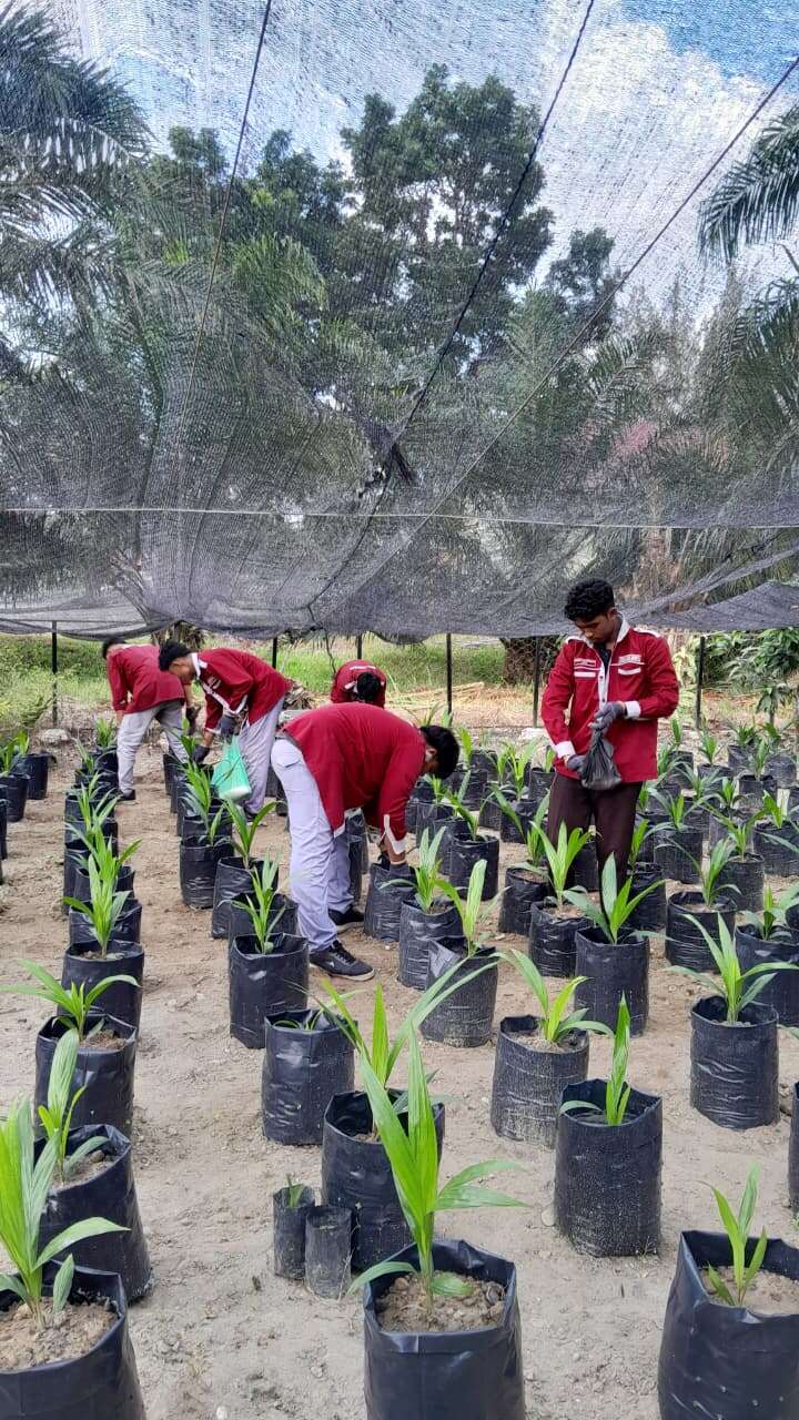 SMKN 1 Peureulak - Peserta didik jurusan Agribisnis Tanaman Perkebunan SMKN 1 Peureulak melakukan kegiatan perawatan bibit sawit di polibag di lahan p...